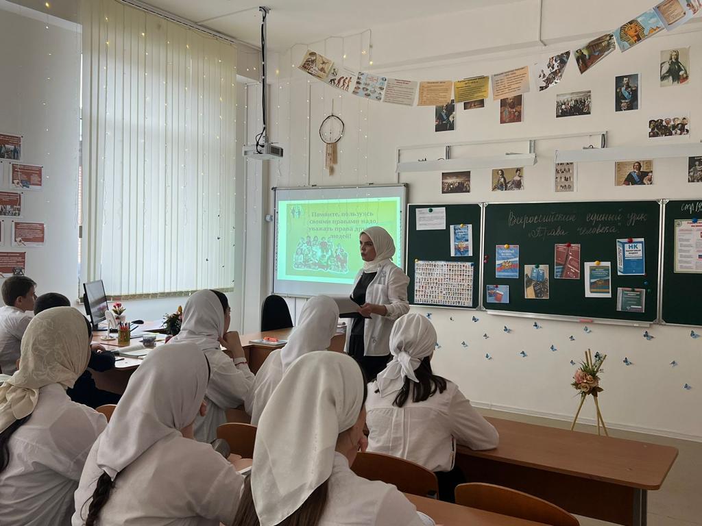 07.12.2022В рамках празднования Международного дня прав человека в 8х классах МБОУ «Курчалоевская СШ №2» был проведен Всероссийский единый урок «Права человека», направленный на формирование правовой культуры молодых граждан нашей страны. Ребята узнали о том, что такое права человека, чем они отличаются от обязанностей, и как жить, не нарушая нормы закона.
