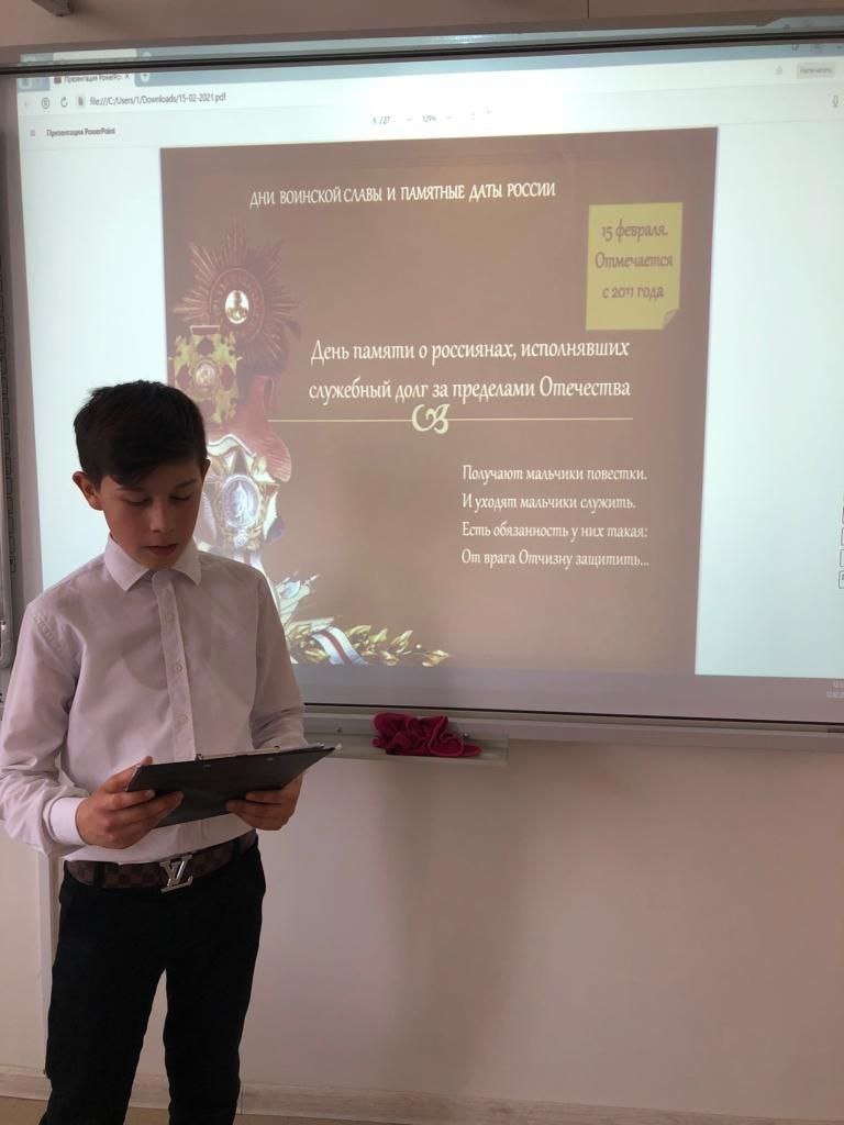 15.02.202415 февраля. День памяти о россиянах, исполнявших служебный долгза пределами ОтечестваНачиная с 2011 года в России отмечается важная памятная дата —День памяти о россиянах, исполнявших служебный долг за пределами Отечества. Дата утверждена Федеральным законом № 320-ФЗ «О внесении изменений в статью 1.1 Федерального закона «О Днях воинской славы и памятных датах России», подписанным Президентом РФ 29 ноября 2010 года.Совместно с активом школы и педагогом истории провели круглый стол "Здесь под небом чужим".#НавигаторыДетства#РосДетцентр#навигаторыпомнять.