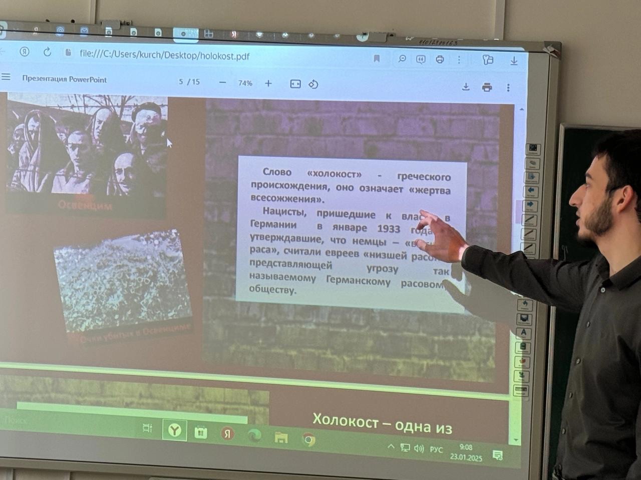 27.01.202525 января 2025г. в МБОУ «Курчалоевская СШ 2» в рамках реализации федерального проекта «Патриотическое воспитание» прошло мероприятие среди обучающихся среднего звена на тему: «День памяти жертв Холокоста». Провел мероприятие учитель истории Абуев Ислам КазбековичЦель: Подчеркивание важности уважения и памяти к жертвам Холокоста. Извлечение уроков из Холокоста и подчеркивание важности избегания нетерпимости, дискриминации и антисемитизма.Мероприятие, проведенное ко Дню Холокоста, было важным шагом в напоминании и памяти о страшных событиях прошлого. Это был день, полный образовательных и эмоциональных моментов, объединивший учеников вокруг цели сохранения памяти о трагедии Холокоста. Ислам Казбекович подчеркнул важность эмоционального переживания, сталкиваясь с трагичностью прошлого через истории выживших, искусство и документальные материалы. Это позволило каждому по-новому почувствовать важность уважения к человеческой жизни и недопущения повторения подобных событий. Мероприятие вызвало сильные эмоции и активное участие учеников. Обратная связь свидетельствовала о том, что мероприятие было не только информативным, но и глубоко вдохновляющим. Ученики выразили готовность продолжать образовательные и активные действия в направлении сохранения памяти о Холокосте.Мероприятие ко Дню Холокоста стало важным шагом в образовании, памяти и предотвращении подобных трагедий в будущем. Он напомнил о важности толерантности, уважения к разнообразию и необходимости активного участия каждого в сохранении исторической памяти.